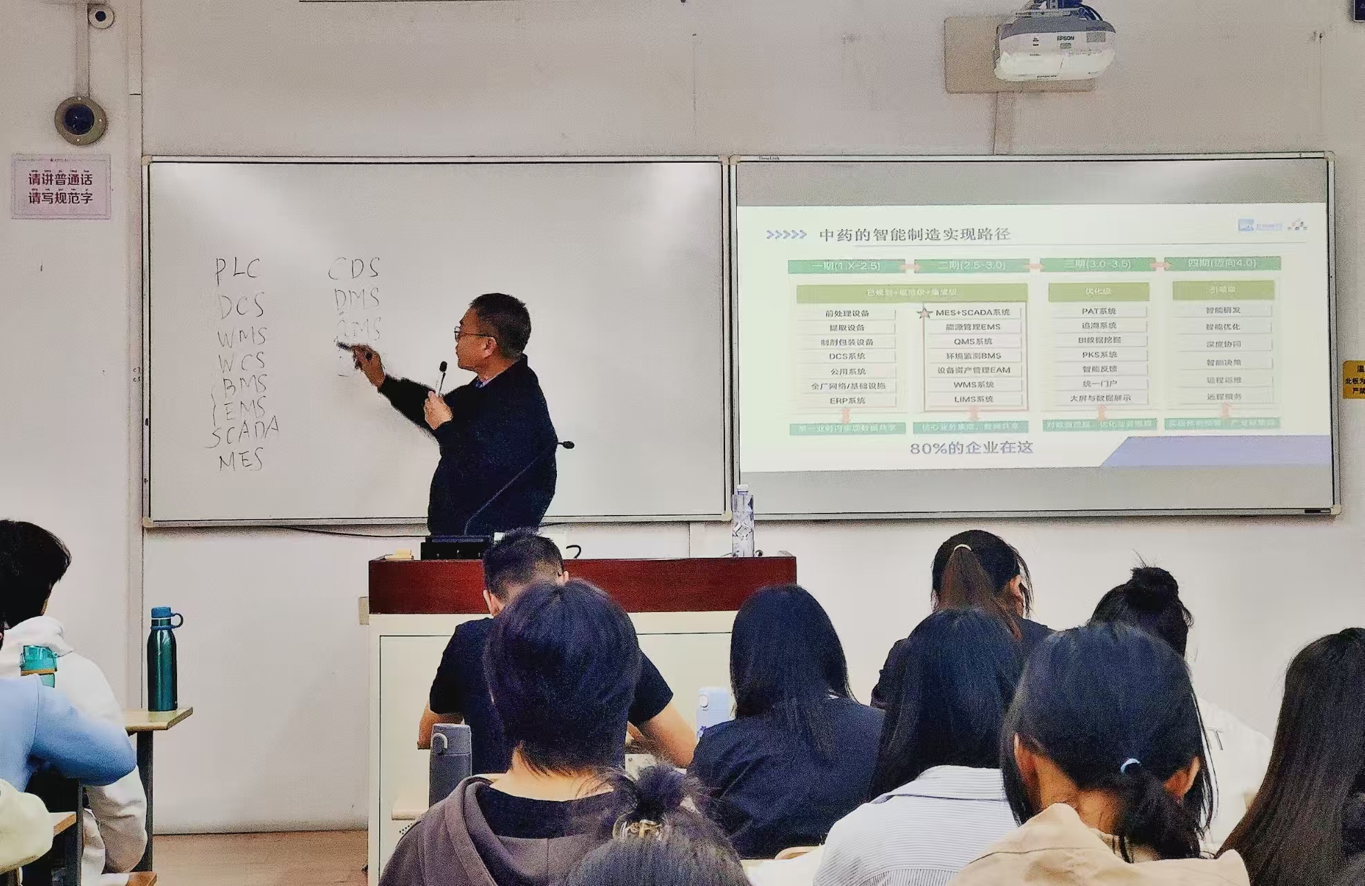 上药杏灵是上药集团旗下现代中药与天然药物制药企业,入选“上海市首批100家智能工厂”以及“上海生物医药产业数字化转型先锋企业”,其银杏酮酯及其制剂在国内银杏叶制剂行业占据领先地位。王军老师首先从国家智能制造发展要求及相关政策法规,向同学们介绍了中药产业实施智能制造和数字化转型的必要性。而后,详细介绍了上药杏灵以创新之力推动发展,通过数智化赋能中药灯塔工厂建设,构建卓越制造体系的实践案例。最后,王老师勉励同学们积极关注行业动态,在努力夯实专业基础的同时,不断增强数智化与信息化能力,为推动中药现代化做出贡献。