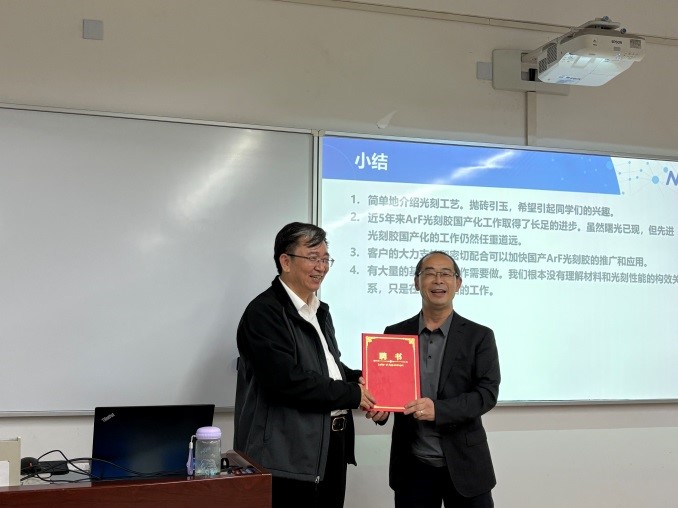 在讲座中,许从应教授不仅介绍了自身的研究方向和企业的开发内容,还详细阐述了我国在过去三十多年中一直困扰的高纯砷烷和磷烷的产业化问题如何得到解决。此外,他还分享了光刻胶研发技术的最新进展及其产业化的动态。课程结束时,许教授与学生们积极互动,解答了他们的提问,并鼓励研究生们为国家和科技的振兴贡献智慧与力量。