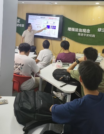 李隽老师针对大一新生,从考研学习、生活、身心健康、技能提升等多个维度,详细阐述了大学四年的规划重点。他结合各阶段的特点,为同学们提供了切实可行的规划建议,帮助大家明确目标,合理分配时间与精力,为未来的学术与职业发展奠定坚实基础。随后,班会进入科研学术分享环节。李隽老师聚焦近期国庆期间“诺奖”颁布的热点事件,特别分享了诺贝尔奖得主的励志故事。李老师借此勉励大家要立足当下,保持对知识的渴望与好奇心,以学校为起点,勇敢攀登学术高峰,努力追求自己的学术梦想。此外,李隽老师还介绍了自己团队的学术研究工作,旨在激发学生对科研的兴趣,为他们的学术探索之路播撒希望的种子。他热情欢迎同学们积极参与科研活动,与团队成员一起交流探讨科学问题,共同成长进步。