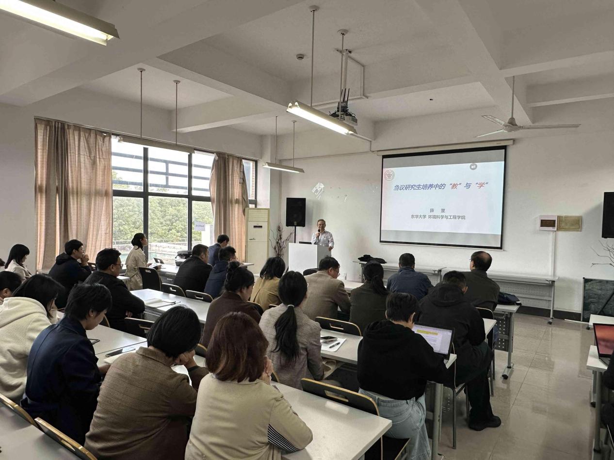 11月11日,新葡的京集团8814于实训楼4418开展研究生导师培训,东华大学博导、水污染控制学科带头人薛刚教授围绕“刍议研究生培养中的‘教’与‘学’”主题和学院82名导师共探育人路径。
