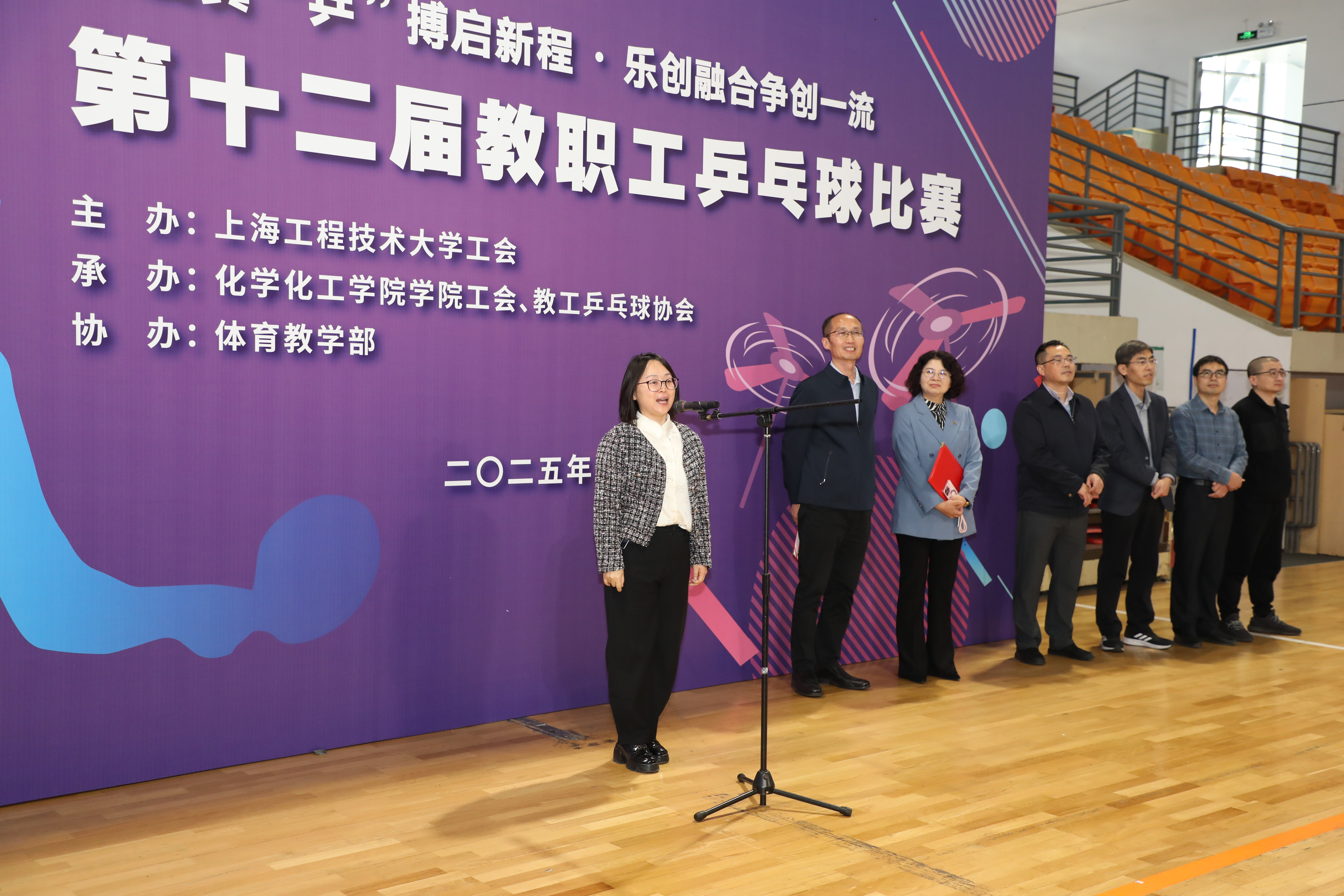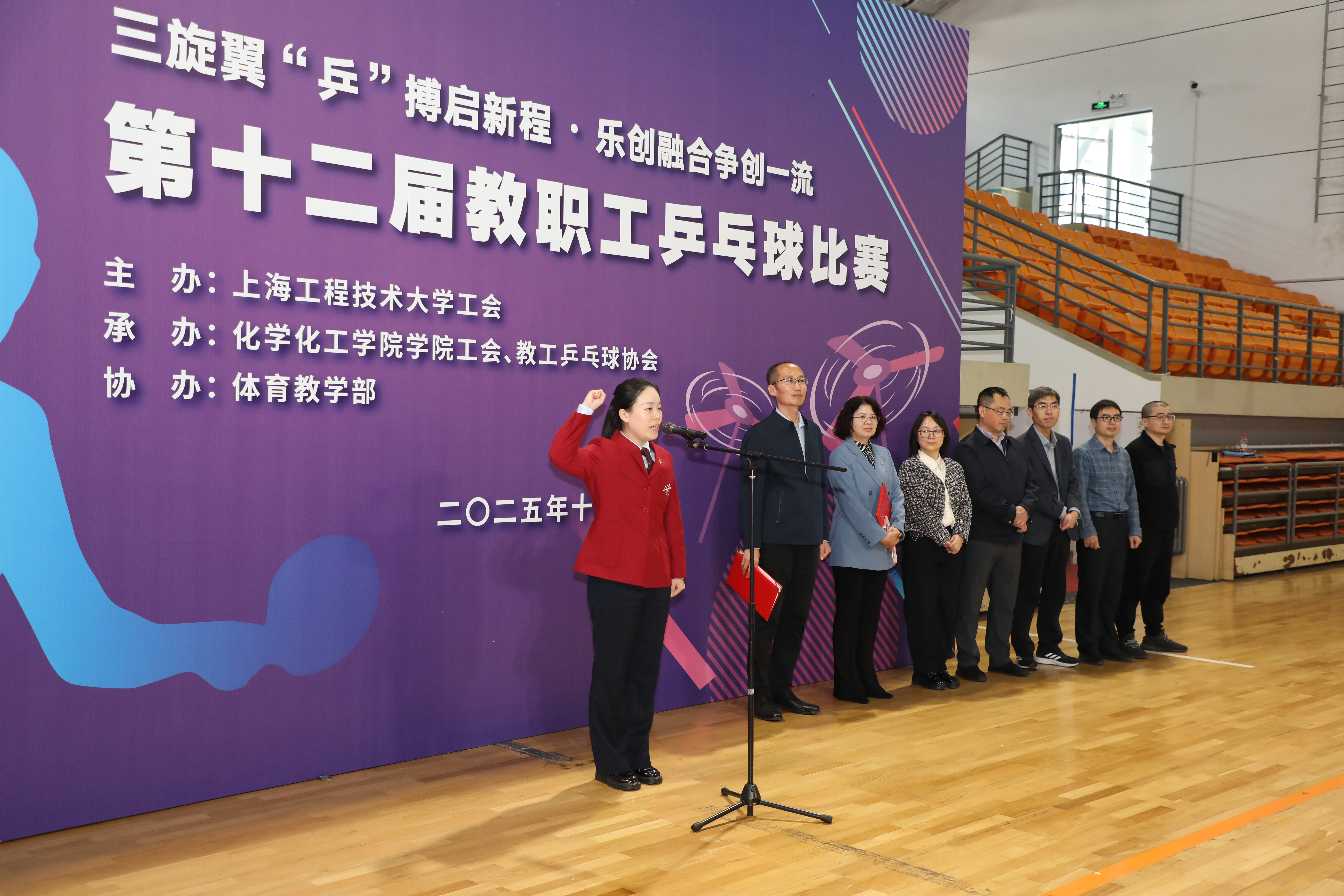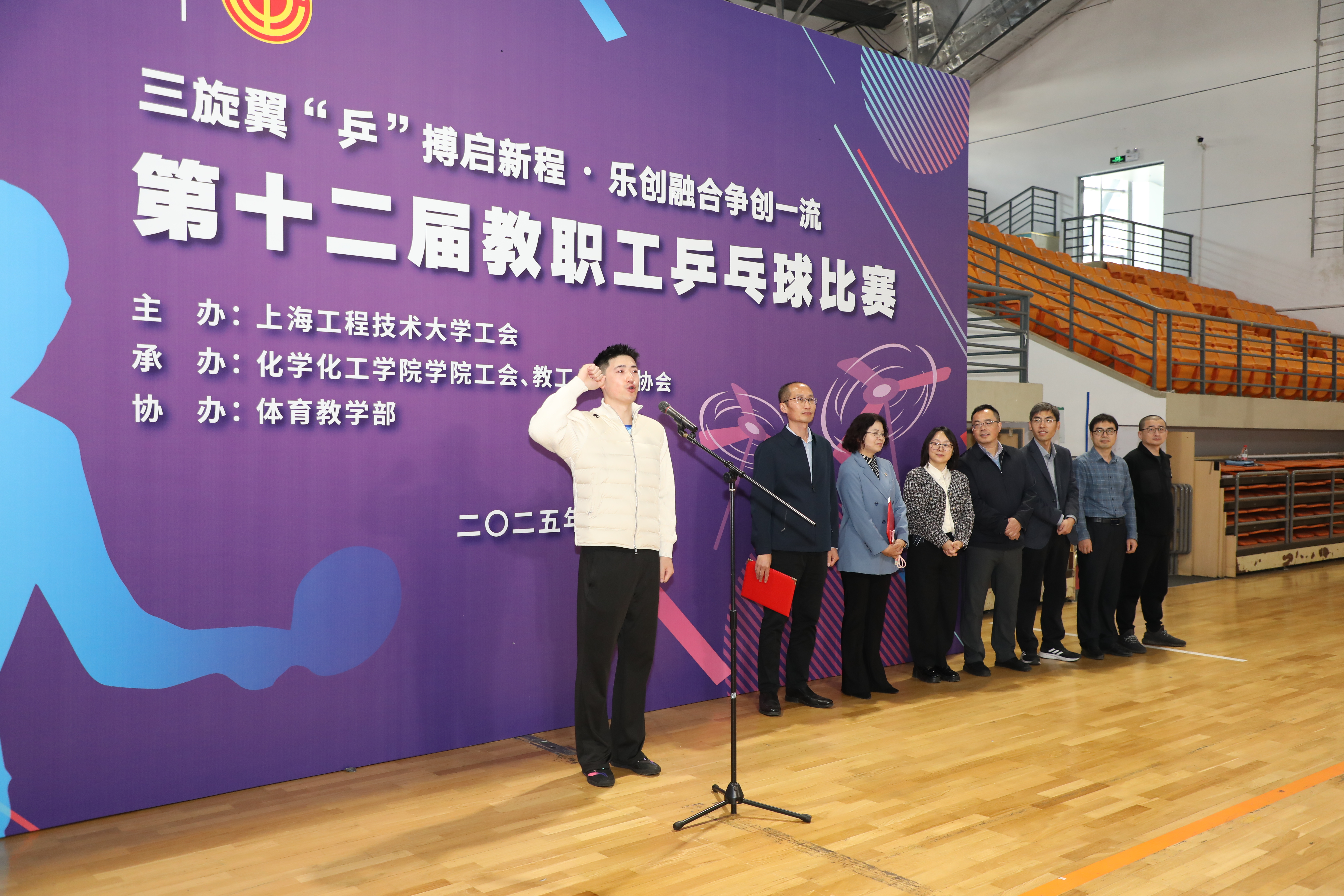 开幕式上,朱书记指出,本次赛事不仅是竞技的舞台,更是‘三旋翼’战略落地的实践场。我们要以奥林匹克精神中的‘更快、更高、更强、更团结’为引领,让每一场对决都成为跨学科交流的契机。朱书记讲到,今天的赛场,既是展现个人风采的舞台,更是凝聚集体智慧的熔炉。希望大家通过这场赛事,不仅收获健康的体魄,更能激发出跨学科创新的灵感——让工程技术的严谨、管理协同的智慧、设计美学的创意在球桌两端交融共生,为建设具有鲜明产业特色的世界一流应用创新型大学注入磅礴动能。运动员代表陈佳栋与裁判员樊骁分别宣誓,承诺恪守体育精神与赛场规则。