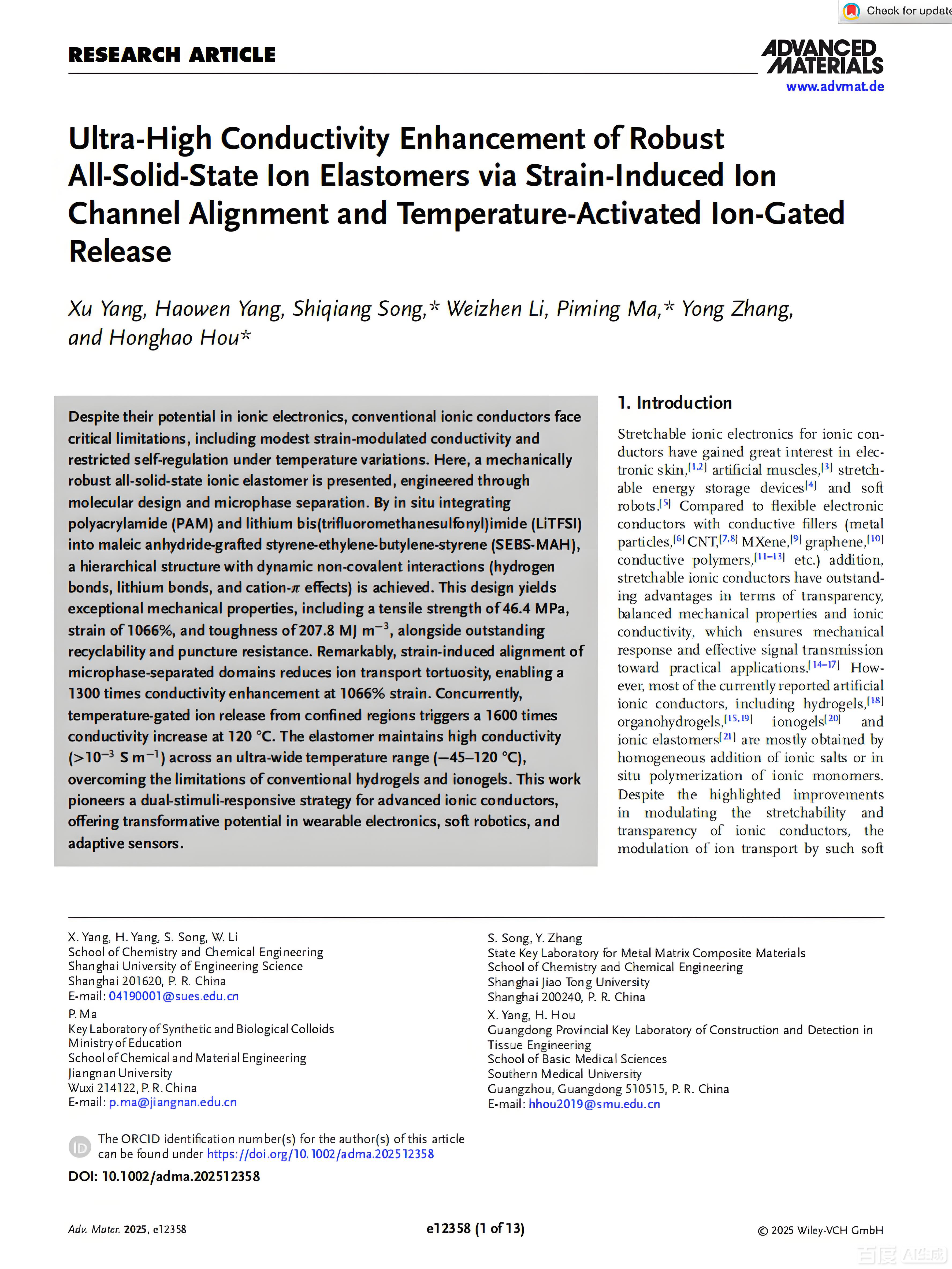近日,我校新葡的京集团8814宋仕强副教授团队在材料科学领域国际顶尖期刊《Advanced Materials》上发表了最新研究成果,论文题目为“Ultra‐High Conductivity Enhancement of Robust All‐Solid‐State Ion Elastomers via Strain‐Induced Ion Channel Alignment and Temperature‐Activated Ion‐Gated Release”。该期刊是材料科学领域的旗舰期刊,以其极高的学术声誉和广泛影响力著称,最新影响因子高达26.8。此项成果是我校以第一单位在该期刊上发表的论文,标志着我校在先进功能材料前沿基础研究方面取得重大突破。