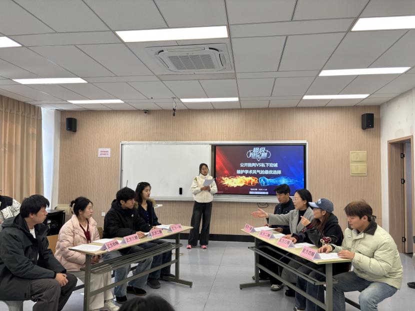 比赛过程中,正反双方围绕“容错空间是否必要”“违规行为的教育意义”“学术处罚的公开性与隐私界限”等核心论点展开深入讨论。正方认为,公开批判能够起到震慑作用,有助于形成明确的学术规范边界;反方则强调,私下劝诫更能兼顾教育效果与心理关怀,让学生在保护性的环境中改正错误。