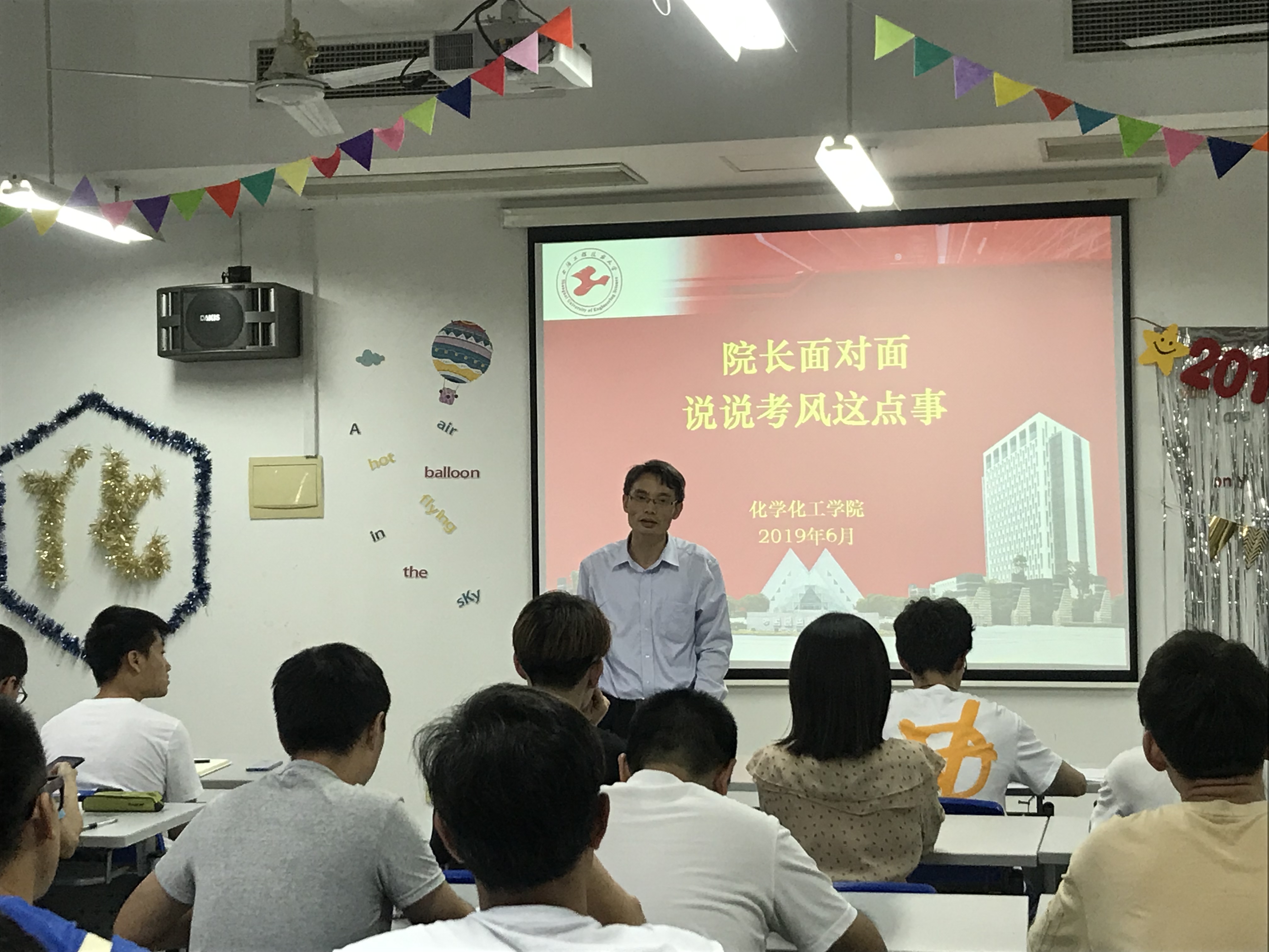 为严肃考场纪律,加强学生诚信考试教育,2019年6月4日下午17:00,新葡的京集团8814在实训楼4405会议室开展院长面对面活动——说说考风这点事。化工学院班委及学生代表共41人参加此次活动。
