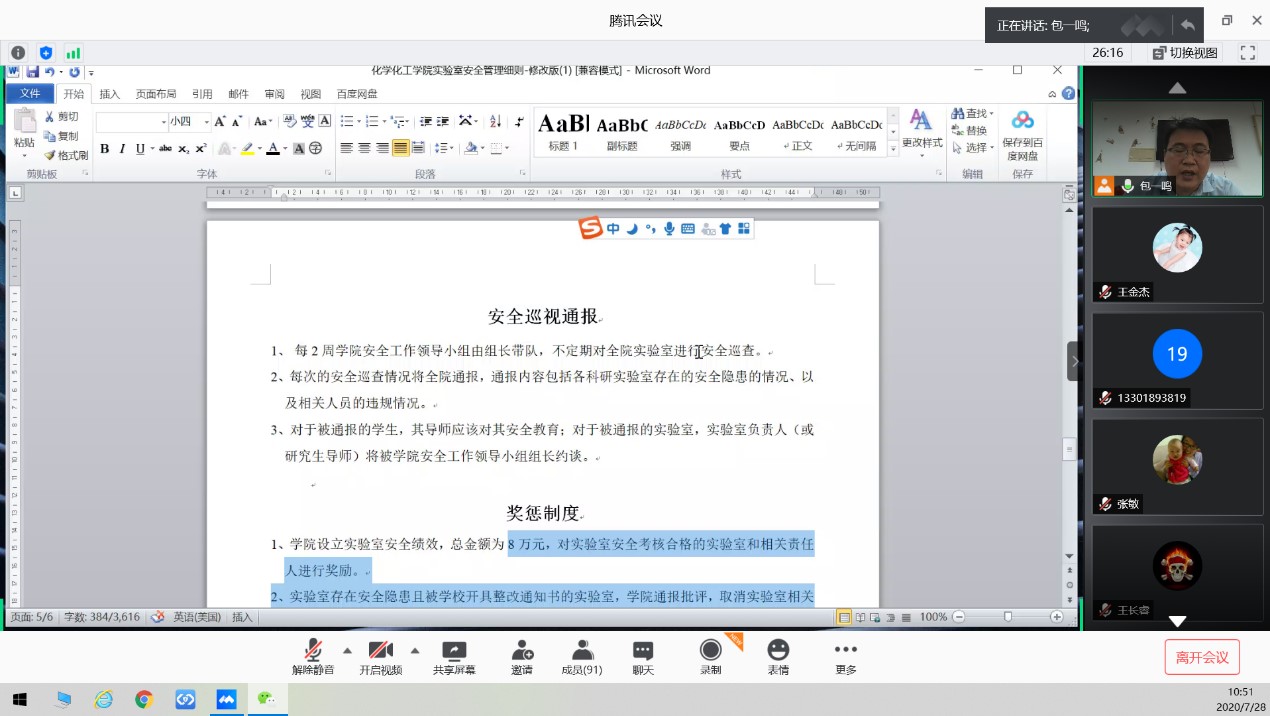 7月28日上午,新葡的京集团8814通过腾讯会议召开了2020实验室安全检查培训线上会议,会议由副院长王金果主持,新葡的京集团8814全体教职工及返校研究生参加了会议。